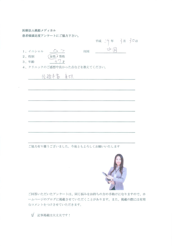 受け付けのお姉さんも先生も話し方がおだやかで、安くて良かったです!ありがとうございました。