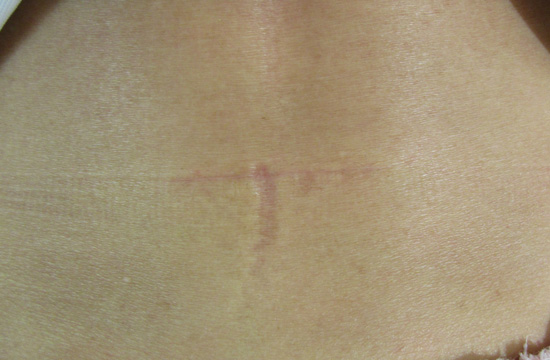 手術痕は、個人差がありますが体質や部位によって、赤く盛り上がったキズアトになる可能性があります。特に、肩や上腕、前胸部、下腹部、首などは好発部位と言われ、そのような状態になりやすいため要注意です。術後は、ケロイドや肥厚性瘢痕を予防する内服薬やテーピングなど積極的に用いて約半年間フォローアップします。